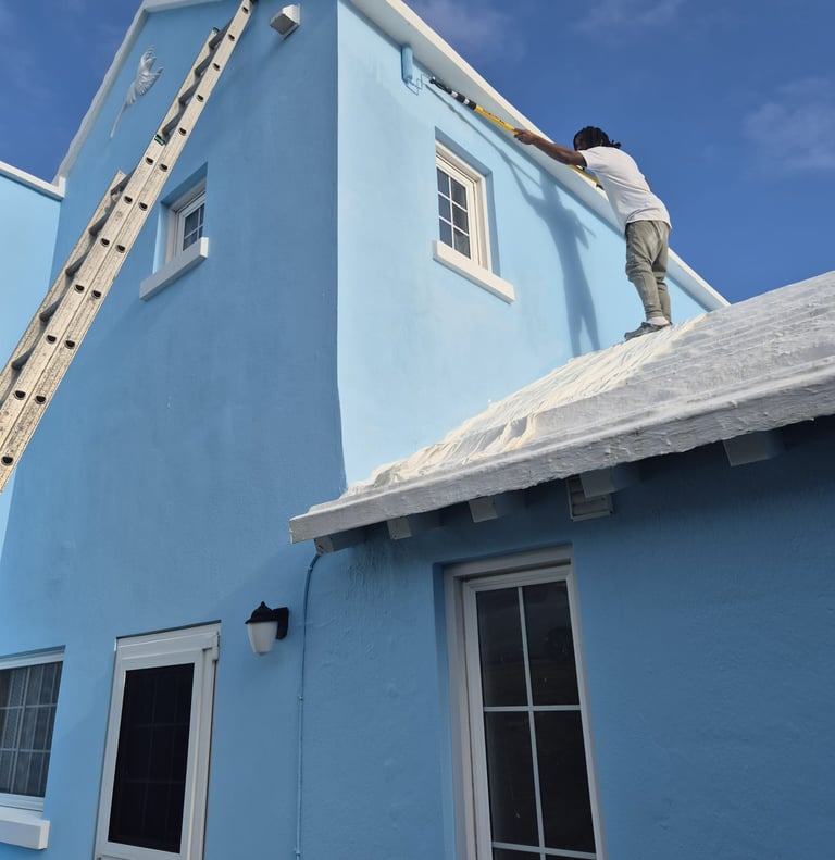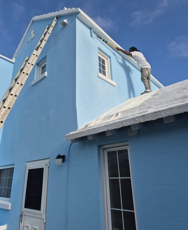 The salt air, humidity, and strong sun in Bermuda can be tough on paint — roofs get dirty overtime, walls peel, and shutters start to lose their shine.